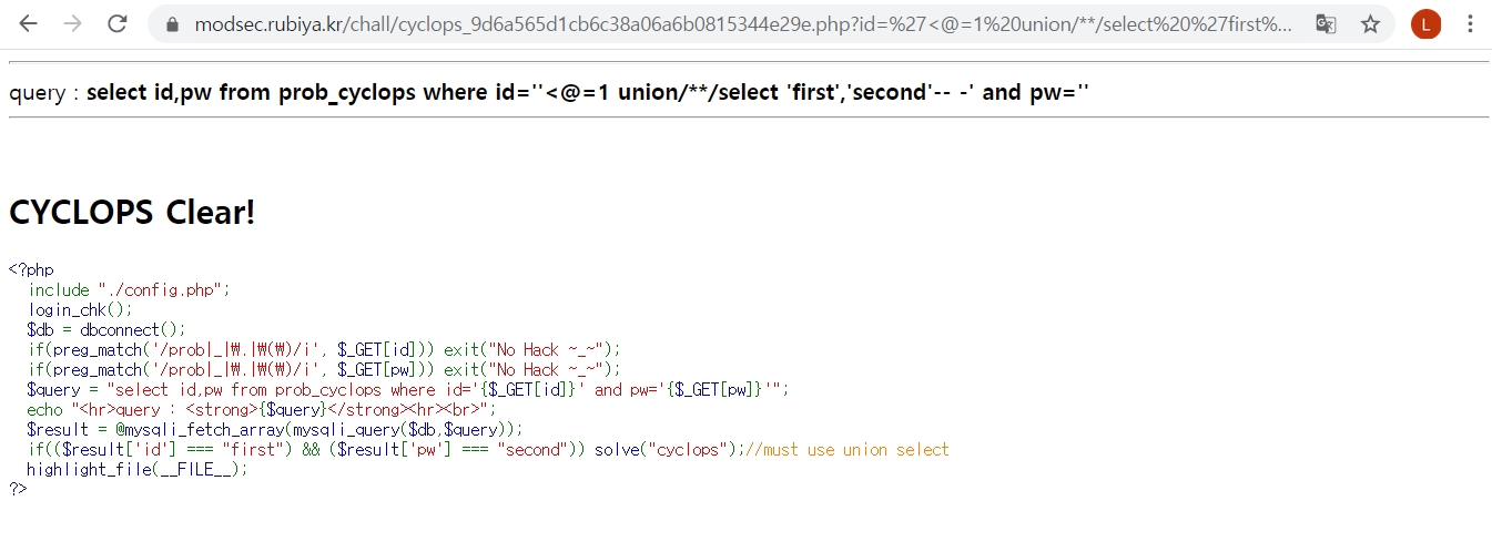 1. if(($result\['id'\] === "first") && ($result\['pw'\] === "second")) solve("cyclops");//must use union select > union select를 할 필요가 있음