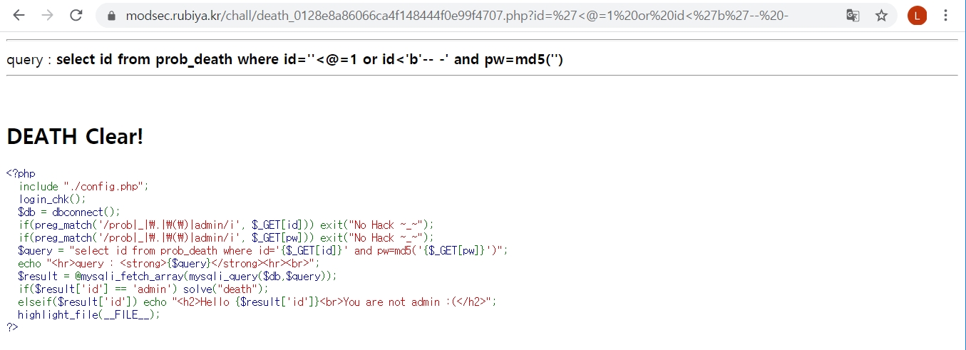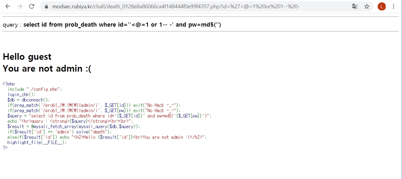 1. if($result['id'] == 'admin') solve("death"); > admin 값을 출력