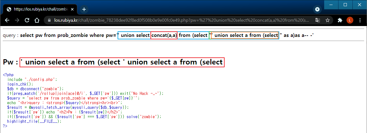 먼저 if(($result['pw']) && ($result['pw'] === $_GET['pw'])) 조건을 만족하기 위해서 쿼리를 통해 결과 값을 출력하도록 한다. prob_zombie 테이블 역시 ouroboros 문제와 동일하게 아무런 값을 가지고 있지 않다. union을 통해 1이라는 값을 출력한다.