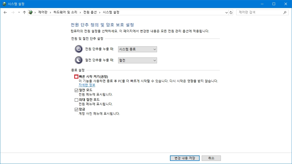 설정 > 전원 및 절전 > 추가 전원 설정 > 전원 단추 작동 설정 > 현재 사용할 수 없는 설정 변경 > 빠른 시작 켜기(권장) 체크 해제