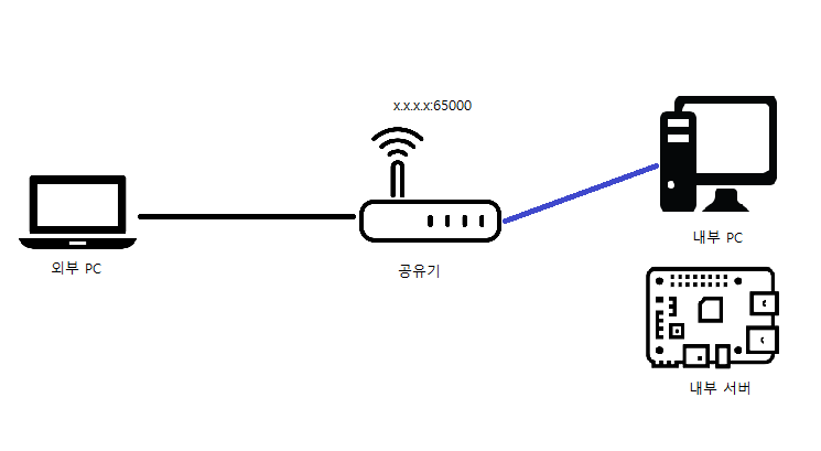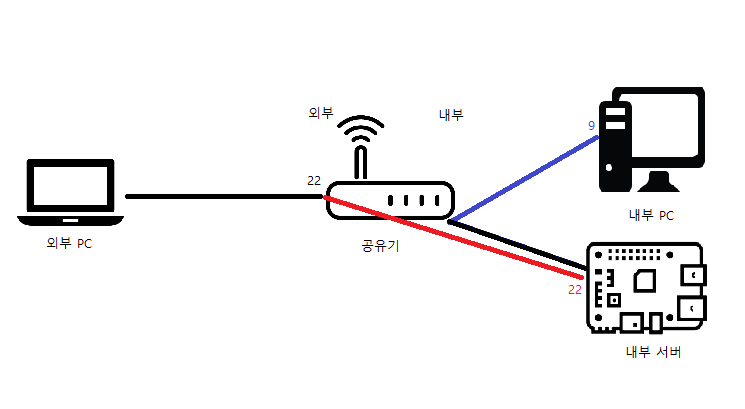 외부 PC에서 22번 포트로 Raspberry Pi 서버에 접근한다. ssh로 접근하기 때문에 내부 서버의 쉘을 사용 가능하다.