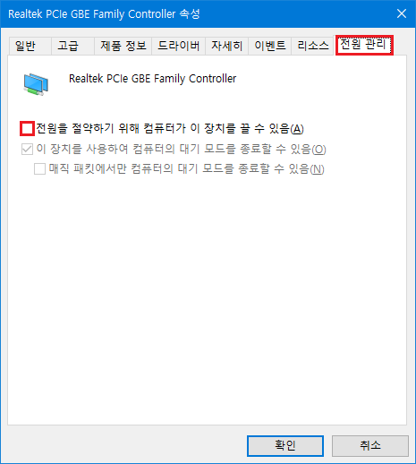 장치 관리자 (devmgmt.msc) > 네트워크 어댑터 > 랜카드 속성 > 전원 관리 > 전원을 절약하기 위해 ... 끌 수 있음(A) 체크 해제