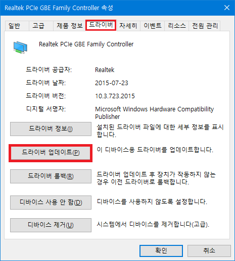 장치 관리자 (devmgmt.msc) > 네트워크 어댑터 > 랜카드 속성 > 드라이버 > 드라이버 업데이트