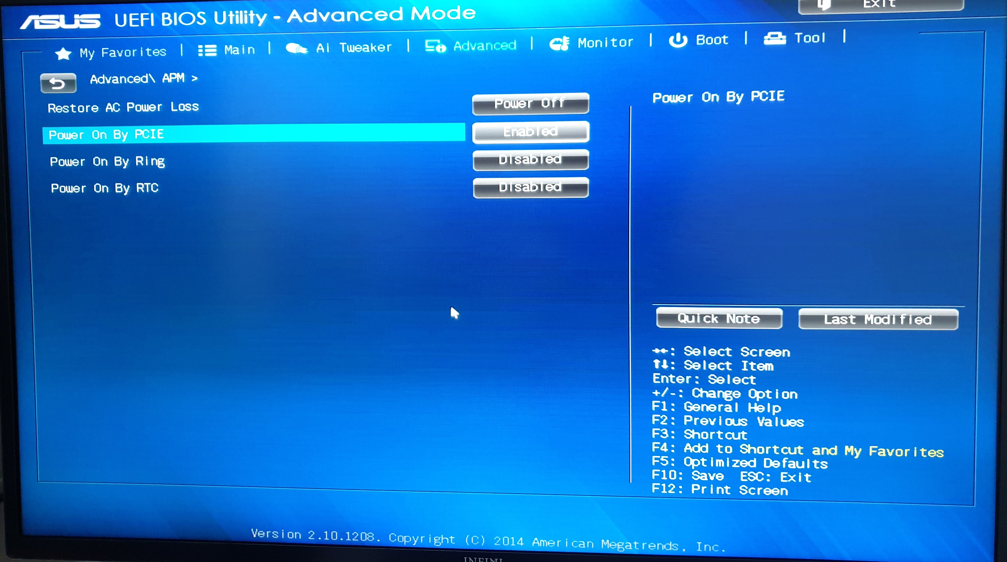 BIOS 진입 > Advance > APM > Power On By PCIE > Enabled