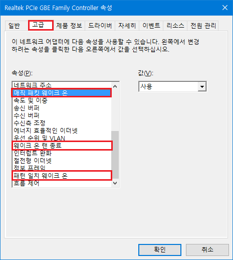 드라이버를 업데이트한 직후 디폴트로 모두 사용(온)되어 있었지만 만약 설정을 다 한 후 WOL 동작이 안한다면 사용으로 되어있는지 재 확인 해준다.