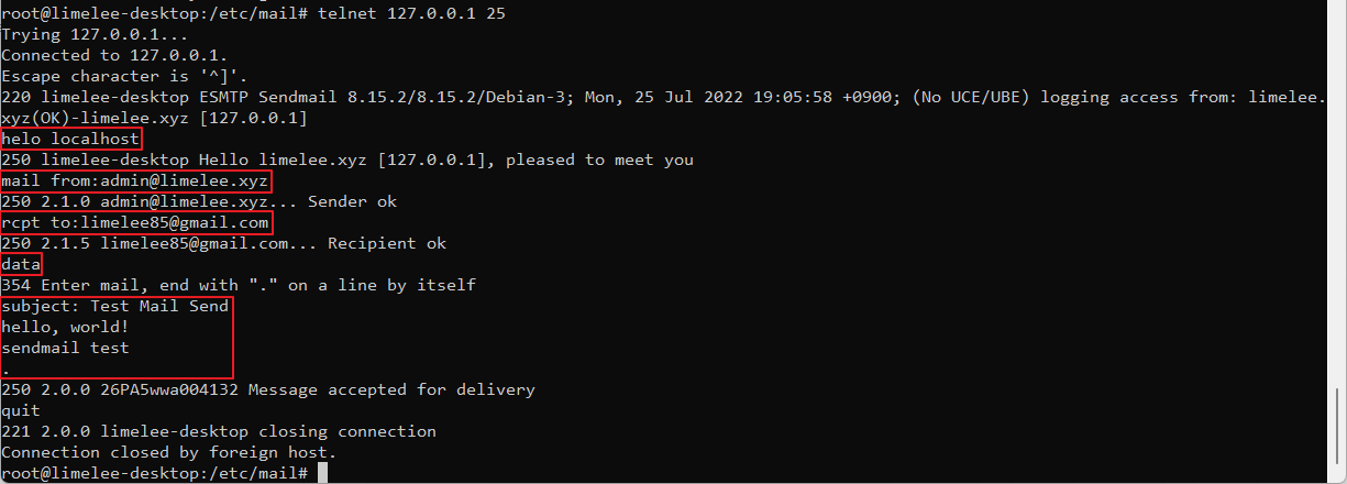 sendmail이 정상적으로 실행되었다면, telnet을 통해 테스트 메일을 발송할 수 있다: