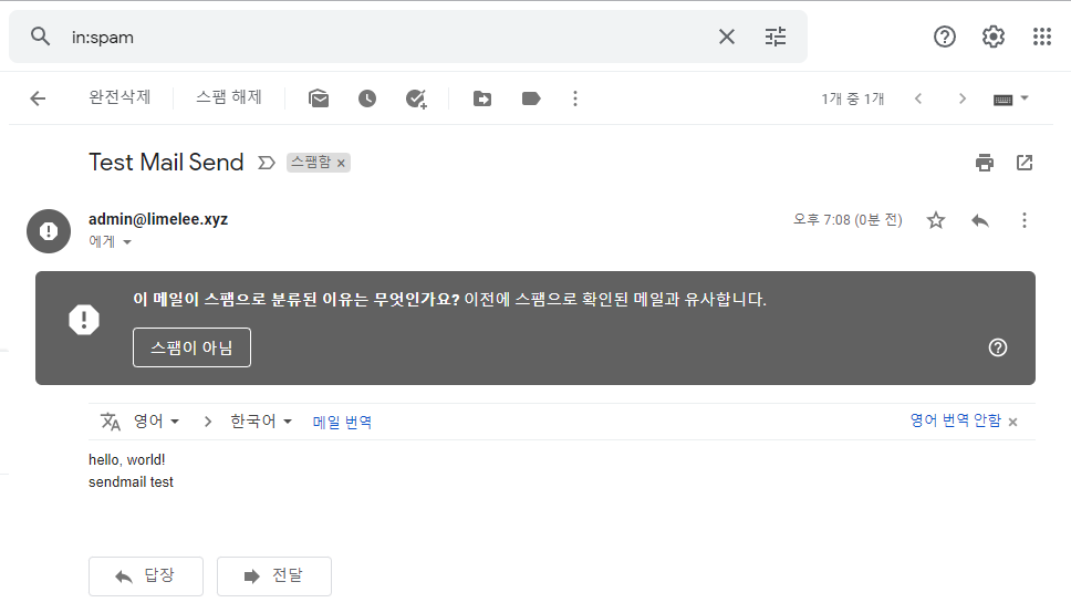 메일 수신자의 메일함을 확인하면, 정상적으로 메일이 발송된 것을 확인할 수 있다. 단, 스팸메일 처리 된다.