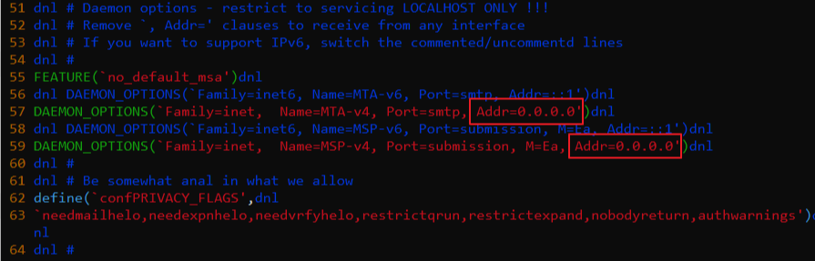 DAEMON_OPTIONS(`Family=inet, Name=MTA-v4, Port=smtp, Addr=0.0.0.0')dnl