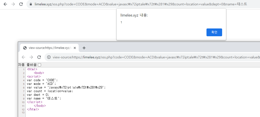 응답 값에는 var value = "javasc\x72ipt:ale\x72t\x281\x29" 가 되어 value 변수에는 실행하고픈 스크립트가 선언된다.